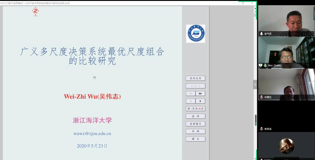应我院邀请,5月23日上午,浙江海洋大学吴伟志教授在腾讯会议作了《广义多尺度信息系统中基于信息熵的最优尺度组合选择》的报告。相关师生聆听了此次报告,报告由陈锦坤老师主持。