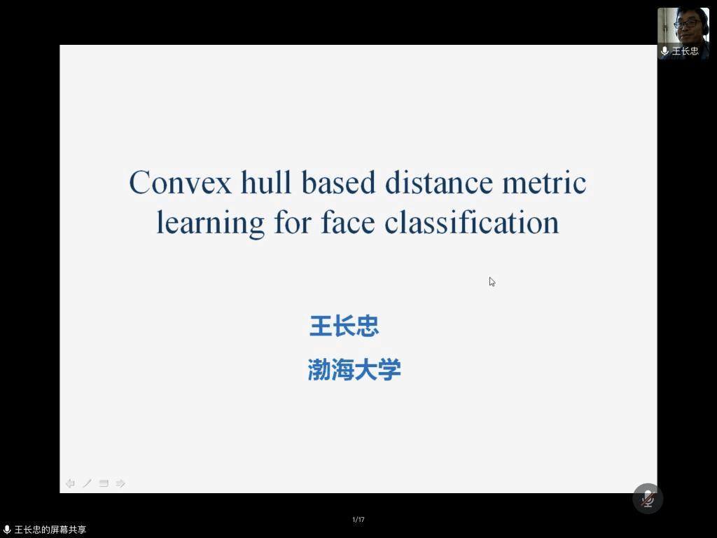 应我院邀请,5月19日下午,渤海大学王长忠教授在腾讯会议作了题为《Convex hull based distance metric learning for face classification》的报告。相关师生聆听了此次报告,报告由林国平教授主持。