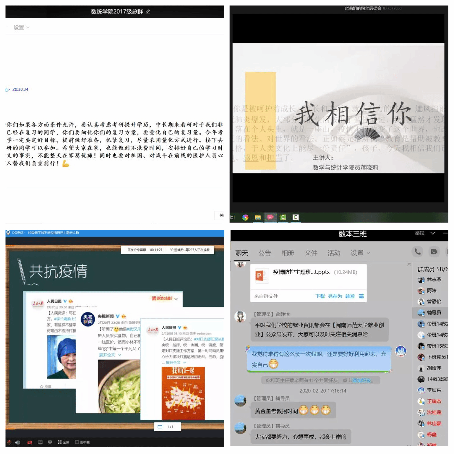 2017级辅导员郭彬彬围绕“疫情防控攻略”、“争做疫情四大员”、“疫情期间考研规划”、“疫情期间实习安排”等主题,给342名同学上了一堂“决胜疫情、从我做起”线上班会课”。郭老师希望同学们以积极的态度面对疫情,同时鼓励同学们参加研究生招考,建议待实习学生充分利用这段时间。