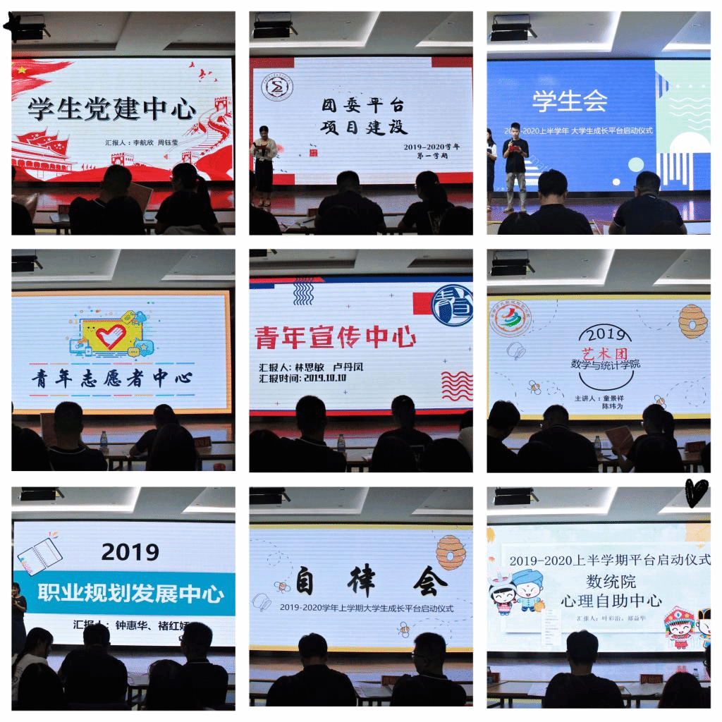 学院各大学生组织将通过思想引领平台、志愿服务平台、学风建设平台、文体建设平台、创新创业平台、公寓文平台六大平台举办系列活动,庆祖国70华诞,用奋斗点亮青春底色。学生党建中心将通过“红色思路”微信公众号,通过艺术展览、主题班会、知识竞赛等活动,庆祝祖国七十华诞,传承红色基因,赓续爱国主义精神;祖国吭歌不止,团委亦立志再向前。团委将通过开设团校培训、利用“两微阵营”开展宣讲教育活动等内容积极朝“打造星级团支部、旨做四型团委”的目标竭力前行;青年宣传中心将积极配合各学生组织在“步追乐跑”、“常青数,快乐学”等活动中发掘“学院三星”,通过“数心电台”等平台,促进师生交流;青年志愿者中心将再次深入贯彻青年志愿服务精神,致力传递“奉献友爱、自信持恒、热心团结”的火炬,举办“华夏子孙共庆华诞、闽师学子筑梦常青”等系列活动;为迎接祖国七十华诞、展现一九“数”舍风采,自律会推出了“筑梦‘数’屋,逐梦‘室’界”、“居安思危,‘救’在身边”等特色活动。学生会结合师范专业认证将开展两赛、实施师范生技能提升计划;心理自助中心将发扬优良作风,秉承鼓励、宽慰、包容理念,在发展和传承中成为更好的自己;“韶华铸师魂,研愿续未来”,职业规划发展中心将携手三大学会,为学院浇育桃李,为广大学子铺设考研、考师资证等便捷之路。艺术团将举办迎新晚会、新生辩论赛、校合唱比赛等活动,为校园生活树起点缀之帆。