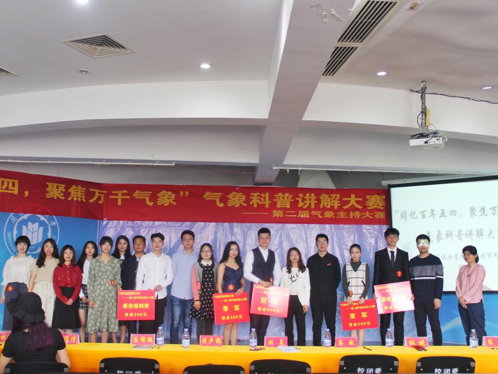 5月9日下午,由漳州市气象局、yl23455永利团委联合主办,学院艺术团、青年志愿者中心承办的“同忆百年五四,聚焦万千气象”——气象科普讲解大赛暨第二届气象主持人大赛在达理活动中心三楼报告厅圆满落幕。漳州市气象局高级工程师黄声锦、陈锦鹏,气象局科普创新团队负责人刘美,校团委副书记蔡斌老师,学院党委副书记林晓老师、团委书记陈明老师及辅导员出席本次活动。