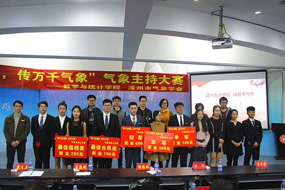 12月28日下午,由漳州市气象协会、yl23455永利团委联合主办,数统学院艺术团、青年志愿者中心承办的的“颂十九大新章,传万千气象”——气象主持人大赛在达理活动中心三楼报告厅圆满落幕。气象台副台长杨锡琼女士、工程师庄毅斌先生、漳州气象台主持人盛飞兵先生担任本次评委,数统学院团委书记、辅导员、各学院组织代表出席本次活动。