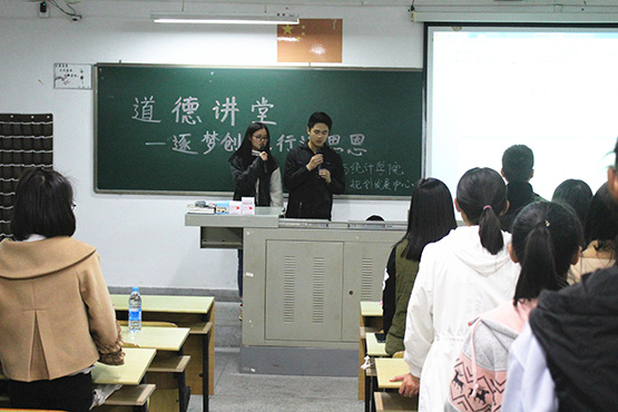 本次道德讲堂主要由优秀校友林延忠分享创业精神、全体成员静默省心、诵读传统经典语录、齐唱《公民道德歌》、播放志愿活动视频、全体师生向“德”鞠躬、作道德承诺等环节组成。在致辞中,林延忠校友分享了自身创业经历及心得,并畅谈以“诚信”为核心、诚实守信、爱岗敬业、办事公道、热心服务、奉献社会等良好职业道德观,旨在增强数统学院学生的创业意识,提高数统学院学生的创业能力,培养正确的创业观和职业道德。陈明老师强调,要做一个有心之人,做一个诚信的人,心怀感恩,用一颗真诚的心,体会中华之传统美德。