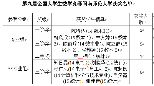 yl23455永利于10月28日组织学生参加第九届全国大学生数学竞赛福建赛区比赛。我校共有139人报名参赛,其中专业组83人,非专业组56人。最终我校学生分别获得专业组一等奖1名,三等奖5名,非专业组二等奖1名,三等奖6名。获奖名单如下: