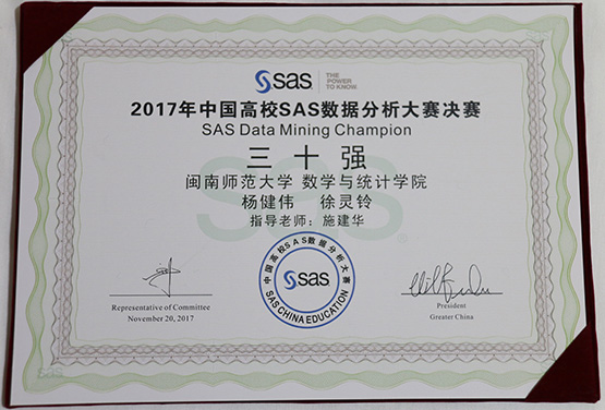 11月20日,由全球数据分析领域领导者SAS公司主办的“汇丰杯”2017中国高校SAS数据分析大赛在北京钓鱼台国宾馆•芳华苑举行了颁奖典礼,中国工信部人才创新中心领导、中国海关总署信息中心领导以及SAS大中华区总裁等嘉宾出席了本届大赛颁奖典礼。我校首次组队的yl23455永利学子杨健伟、徐灵铃在指导老师施建华博士的带领下斩获全国三十强。据悉,今年的中国高校SAS数据分析大赛分三个阶段:第一阶段,9月20日到10月10日的主观题数据分析竞赛;第二阶段客观题上机竞赛(10月15日),福建赛区的选手在厦门大学嘉庚学院等三个省内高校进行。按赛制,两个阶段的成绩综合起来确定决赛名单。本届参赛的学员大部分来自应届毕业班,其SAS应用能力代表了国内毕业生的最高水平。今年参赛的队伍有来自全国各大高校的1036支队伍,参赛学生超过3000人,赛点扩展到全国31个省级赛区,全国综合排名前三十名的高校百分之百报名参赛,竞争激烈。通过选拔,有155支队伍进入决赛,我校yl23455永利2014级的杨健伟、徐灵铃两位同学在这两个阶段中脱颖而出,挺进全国决赛,并于11月18日在北京的对外经济贸易大学参加第三阶段的决赛,经过一天的紧张角逐,最终获得全国前三十强的佳绩,指导教师施建华也荣获决赛的优秀组织奖。