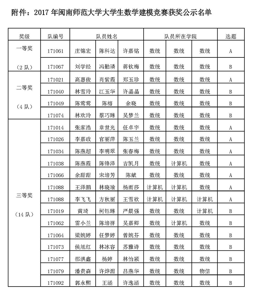 2017年闽南师范大学大学生数学建模竞赛评阅工作已于2017年6月24日结束。为严肃竞赛纪律,杜绝不当之风,竞赛组委会决定设立获奖结果争议期,为期5天。现将获奖名单征求异议稿公布如下,公开征求广大师生的意见。