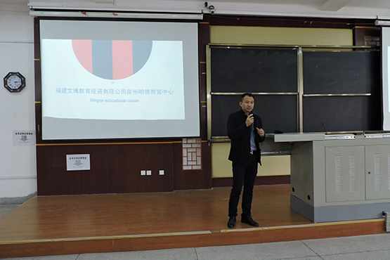 12月15日下午3:00,福建金帝集团旗下教育品牌福建泉州外国语中学、福建泉州明德教育中心专场宣讲会在砺志楼120顺利举行。泉州明德教育中心校长郭文峰、泉州外国语中学招师办公室主任杜增产作为主讲人出席本次宣讲会。yl23455永利、物理与信息工程学院、化学与环境学院以及外国语学院部分13级学生积极参与。