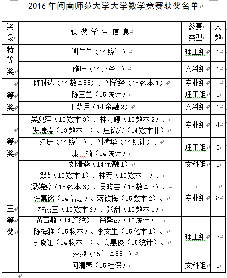 2016年闽南师范大学大学数学竞赛试卷评阅、评奖工作已于2016年11月30日结束。针对此次竞赛中成绩特别突出的两位选手,经竞赛组委会讨论决定,特设理工组和文科组特等奖奖项。为严肃竞赛纪律,杜绝不当之风,竞赛组委会决定设立获奖结果争议期,为期7天(2016年12月1-7日)。现将拟获奖名单(见附件)公布如下,公开征求广大师生的意见。