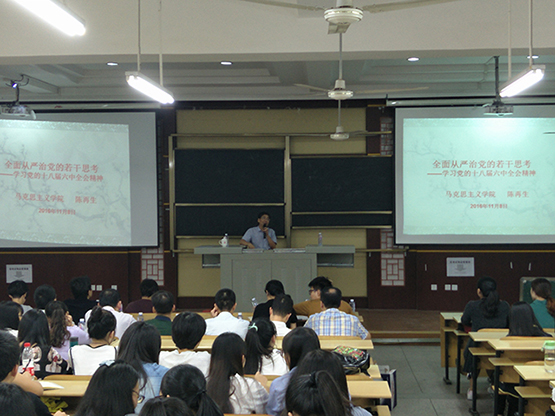 11月8日下午,我院邀请马克思主义学院陈再生院长为全院师生党员举行以“全面从严治党的若干思考——学习党的十八届六中全会精神”为主题的专题学习会。