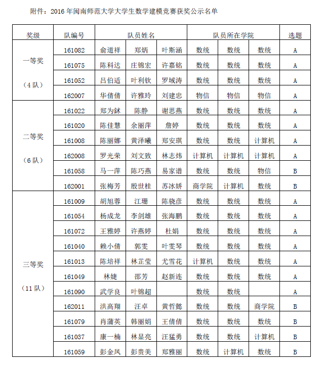 2016年闽南师范大学大学生数学建模竞赛评阅工作已于2016年5月30日结束。为严肃竞赛纪律,杜绝不当之风,竞赛组委会决定设立获奖结果争议期,为期5天。现将获奖名单征求异议稿公布如下,公开征求广大师生的意见。
