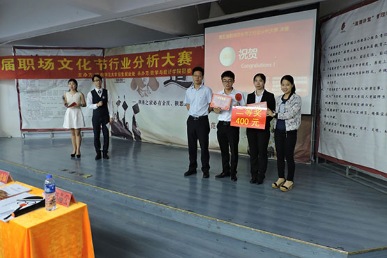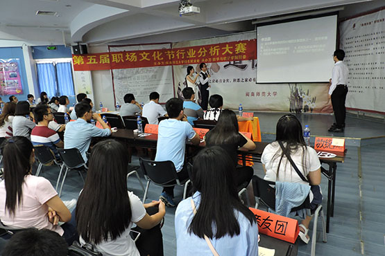 5月22日,由闽南师范大学招生就业处主办,我院承办的第五届职场文化节行业分析大赛决赛在达理活动中心三楼举行。比赛邀请华福证券有限责任公司高级投资经理陈晓青、福能期货股份有限公司漳州营业部业务一部副总经理兰天明、闽南师范大学招生就业处就业科科长方胜强、历史系党总支秘书梁忠福担任评委。我院党委副书记陈晶莹老师及学院辅导员共同观看比赛。