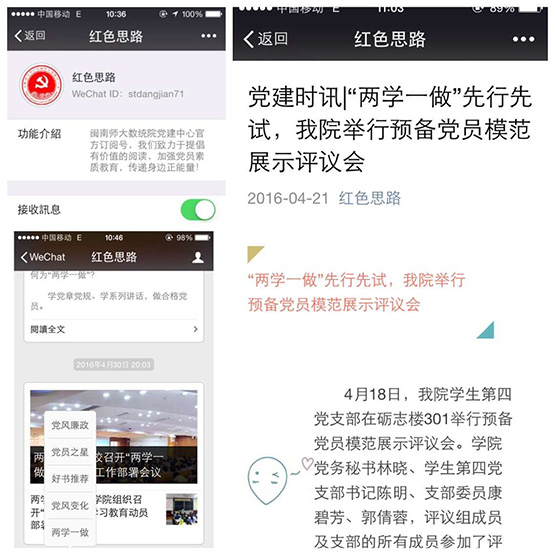 为了更好宣传推进“两学一做”学习教育,营造良好的活动氛围,我院党委高度重视,认真研究部署,广辟宣传阵地,既发挥传统宣传阵地如学习动员会、宣传栏等的宣传效应,同时也适应形势发展要求充分利用网络新媒介如QQ群、“两学一做”学习教育专题网、微信、微博等宣传渠道,在全院范围内迅速掀起“两学一做”学习教育热潮,确保广大师生党员都能积极投身到活动中,准确把握上级精神,及时了解动态,合力推进工作部署,扎实有效促进活动的深入开展。