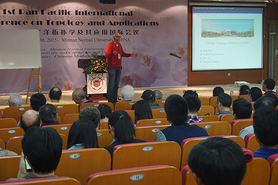 由中国科学院院士、四川大学刘应明教授等担任顾问委员会的首届泛太平洋拓扑学及应用国际会议(1st Pan-Pacific International Conference on Topology and Applications) 于2015年11月25日至11月30日在闽南师范大学成功举行。本次会议由汕头大学、首都师范大学、闽南师范大学共同主办和中国数学会协办。11月26日上午,首届泛太平洋拓扑学及应用国际会议在闽南师范大学逸夫图书馆会议厅开幕,中国科学院院士、北京大学姜伯驹教授,俄罗斯莫斯科大学Alexander V. Arhangel’skii 教授,闽南师范大学校长李进金教授等国内外代表出席了开幕式。开幕式由闽南师范大学“闽江学者讲座教授” 、新西兰奥克兰理工大学曹继岭教授主持,李进金校长代表大会主席团及闽南师范大学致欢迎词,加拿大多伦多大学Franklin Tall教授代表大会顾问委员会讲话,荷兰阿姆斯特丹大学Jan van Mill教授宣布Yinhe Peng博士荣获2015年度Marry Ellen Rudin青年研究者奖, Latie Wen女士代表国际著名Elsevier出版集团为Peng博士颁奖。