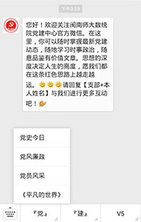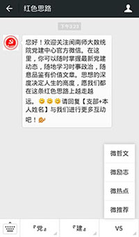 本学期以来,我院经过认真筹划精心准备,积极推出党员微信公众学习平台“红色思路”,该平台开设了党风廉政、党员风采、党史今日、微热点、微哲文、微励志等特色栏目,每周定期推送相关内容,倡导党员进行有价值的阅读和提升,致力于打造一个能提高党员内在党性修养的思想政治教育平台,也为党组织和党员间提供一个互动交流的及时有效平台。通过这一学习平台的运作,确实解决教师党员理论学习不深入和学生党员入党后续教育不足理论学习不够的难题。