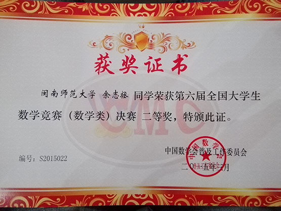 近日,传来喜讯,我院余志拯同学荣获第六届全国大学生数学竞赛(数学类)决赛二等奖,高年级组排名15,位列二等奖第三位,该同学在福建赛区比赛中脱颖而出,被推荐参加全国总决赛,通过努力取得了佳绩,为母校赢得了荣誉。此次竞赛由中国数学学会主办,旨在,培养人才、服务教学、促进高等学校数学课程的改革和建设,提高大学生学习数学的兴趣,培养分析、解决问题的能力,发现和选拔数学创新人才,为青年学子提供一个展示基础知识和思维能力的舞台。