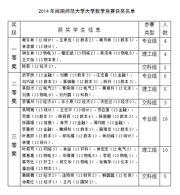 2014年闽南师范大学大学数学竞赛试卷评阅、评奖工作已于2014年12月2日结束。为严肃竞赛纪律,杜绝不当之风,竞赛组委会决定设立获奖结果争议期,为期7天(2014年12月2-9日)。现将获奖名单征求异议稿公布如下,公开征求广大师生的意见。
