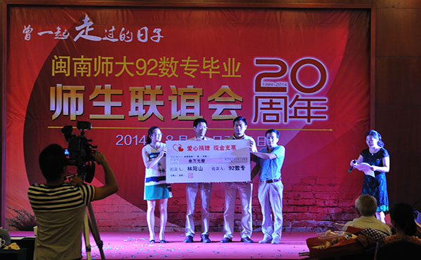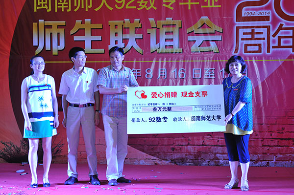 浓浓母校情 拳拳校友心,为了感恩回馈母校的栽培,在师生联谊会上举行了闽南师范大学学生“励志项目”捐赠仪式,92数专捐款人民币叁万元用于资助母校学生创业、留学等“励志项目”活动。