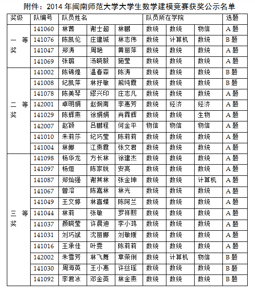 附件:2014年闽南师范大学大学生数学建模竞赛获奖公示名单