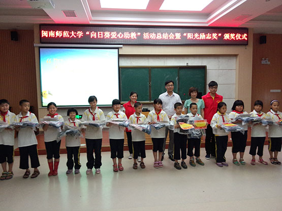 大会总结了“向日葵爱心助教”活动的成果,回顾了志愿者们与闽南师大附小的同学们在助教过程中温暖的点滴。同时,yl23455永利志愿者中心还特意设立了“阳光励志奖”,用母亲节义卖康乃馨筹到的善款购买文具作为奖品,奖励那些在爱心助教活动中励志的同学。此次获奖的十五名同学都是家庭困难的学生,其中十名是附小红旗班的外来务工子女。韩春茂校长以及少先队总辅导员柯春华老师为各位获奖同学颁奖,并合影留念。