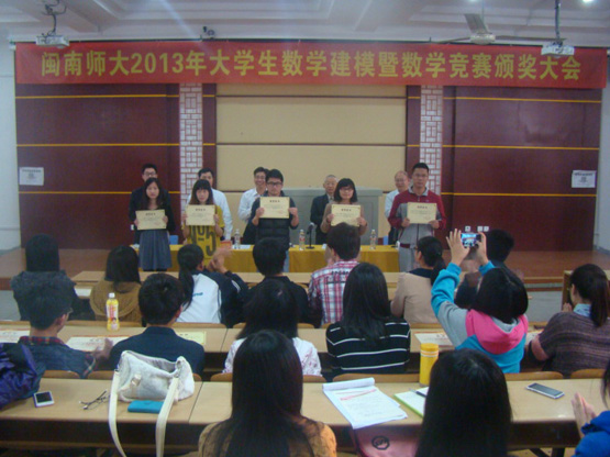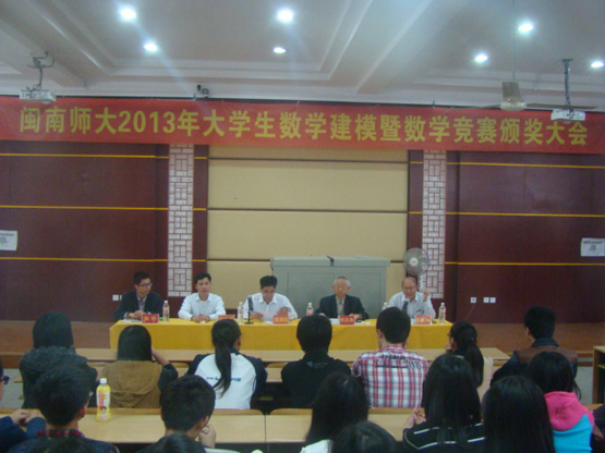 2014年4月3日下午4:30,闽南师大2013年大学生数学建模暨数学竞赛颁奖大会在砺志楼120隆重举行。出席本次大会的领导老师有校教务处处长陈再生教授、yl23455永利院长李克典教授、党总支书记徐志怀教授、副院长陈跃辉副教授、团委副书记陈明老师、各学院获奖学生及部分学生代表共计两百五十多人。此次颁奖大会是对我校在2013年全国“两赛”及校级“两赛”中所取得优异成绩进行总结和表彰,旨在鼓舞我校师生在今后全国大学生数学建模竞赛和数学竞赛中再创佳绩,实现新突破。