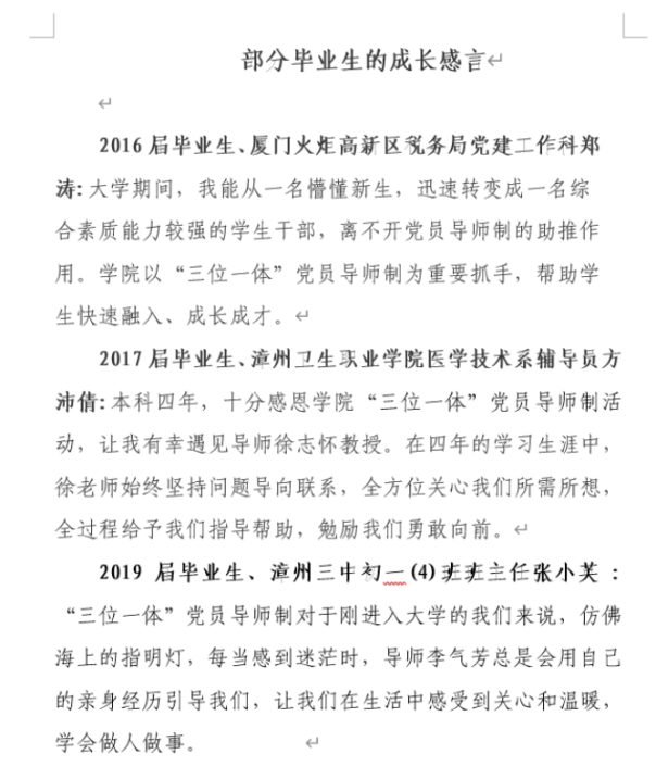 2015年,学院党委制定《关于实行教工党员担任学生导师、入党申请谈话人及发展党员联系人“三位一体”党建育人的通知》文件