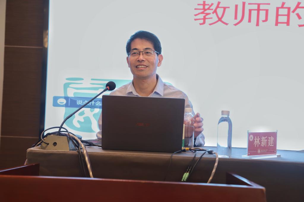 随后,在专家报告环节,福清市教师进修学校林新建老师、闽南师范大学yl23455永利周仕荣教授分别进行报告。林新建老师围绕着题为《核心素养背景下教师的“取势明道和优术”》学术讲座。林新建老师从“观念成就人生”、“取核心素养之势”、“明学习道优教学术”、“做‘四有’老师”四个方面论述了核心素养背景下教师核心素养的培养,强调教书育人要做成事业而非职业,并题诗一首送给了与会的师生们。