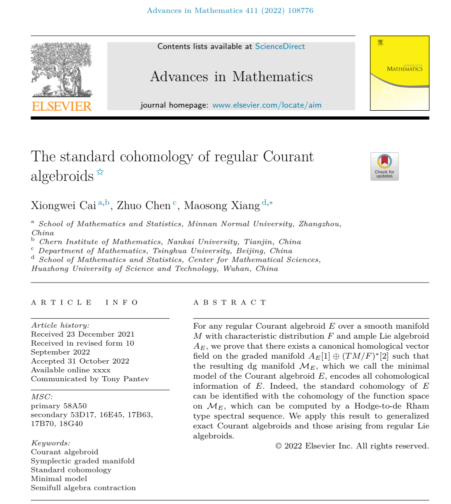 近日,我校yl23455永利青年教师蔡雄伟博士与清华大学陈酌、华中科技大学向茂松两位老师合作,以第一作者并以我校为第一署名单位在国际顶级数学期刊《Advances in Mathematics》上发表题为《The standard cohomology of regular Courant algebroids》的学术论文。