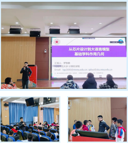 上午,罗智鹏老师以“从芯片设计到大语言模型基础学科作用几何”为主题展开专题讲座。首先在“芯片设计”中用幽默风趣的语言解释了芯片的定义,分类和作用,以自动驾驶汽车为例提出问题;接着在大语言模型中,以GPT为例和同学们展开激烈讨论,带动学员们在课堂上的积极思考。最后,罗老师寄语学员们:“生命有时,宇宙无疆,脚踏实地,胸怀浩瀚。”希望大家在今天的课堂有所收获。