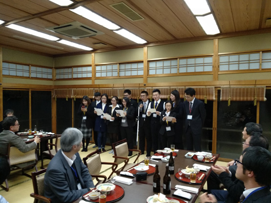 然后在宴会厅里,宴会开始之前,由杉江教授为中方10名研究生颁发了《参加JST项目荣誉证书》与纪念品。接着在品尝纯粹日式乡土料理同时,10名研究生张开歌喉演唱赴日前刚刚学唱的日本歌曲“四季歌”,出口副校长与其它日本老师、学生为大家拍手助唱。紧接着郭宝霖老师代表我院向出口副校长等各位领导与老师赠送了福建省的“白芽兰茶”铭茶,他们非常高兴,欣然接受。
