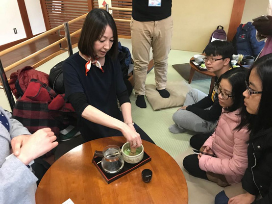 岛根大学还安排我院一行参观了具有400多年历史的松江古城楼,并且攀登了被誉为日本国宝之一的“天守阁”,使他们了解到松江市的历史变迁,以及日本古代的政治结构。在古城楼之上,松江市景色尽收眼底。在严冬季节,松江城的护城河也成为旅游的项目,学生们坐在游船上绕城游览很是惬意。此外,还带领他们在手工作坊中自己动手制作各种形状的糕点,并且伴着日本的传统“抹茶”,品尝自己刚刚做成的点心,真是别有一番情趣呀!