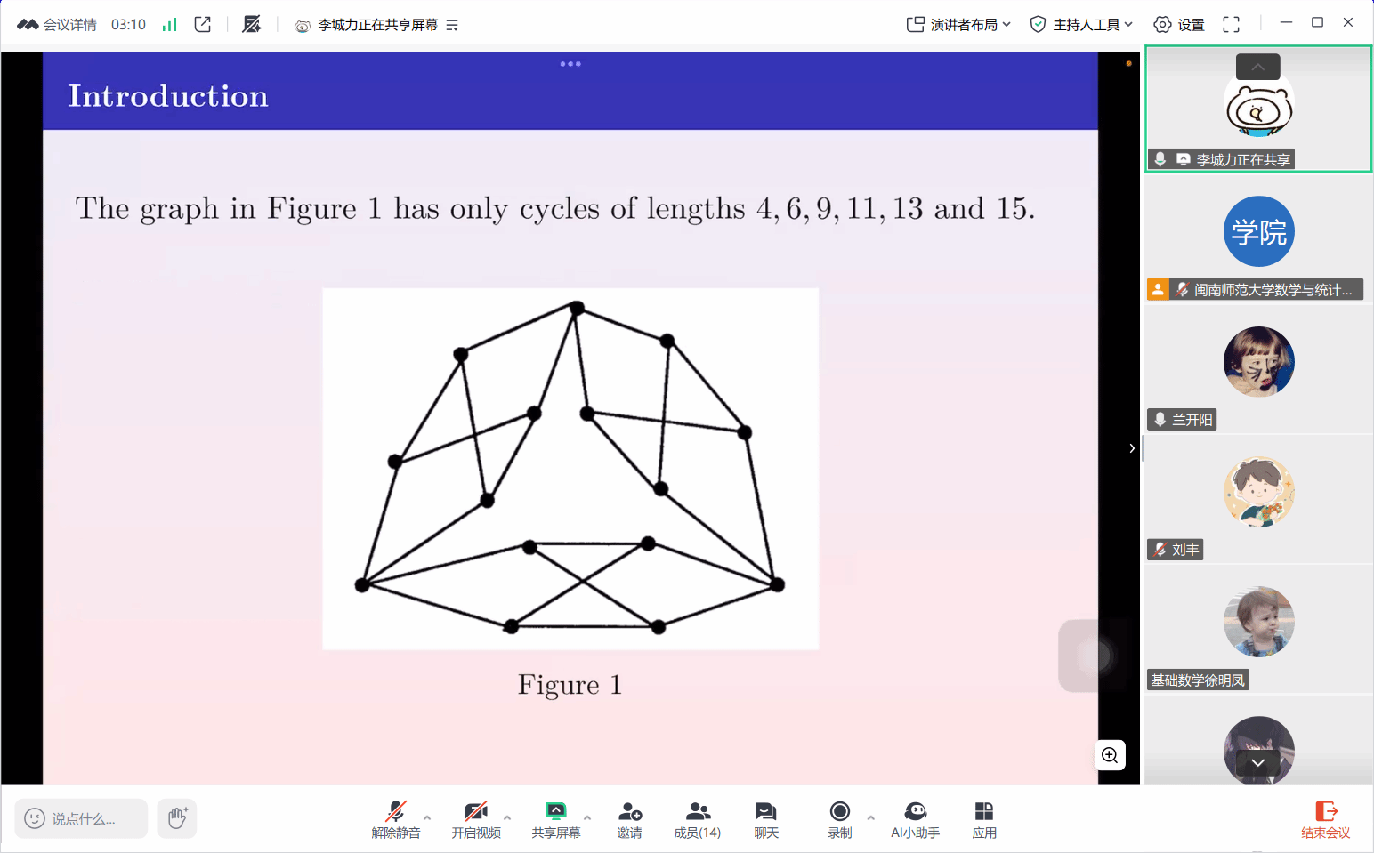 应我院邀请,9月10日上午,华东师范大学李诚力博士在腾讯会议作了题为《Cycles of consecutive lengths in 3-connected graphs》的讲座。相关师生聆听了此次讲座,讲座由兰开阳老师主持。
