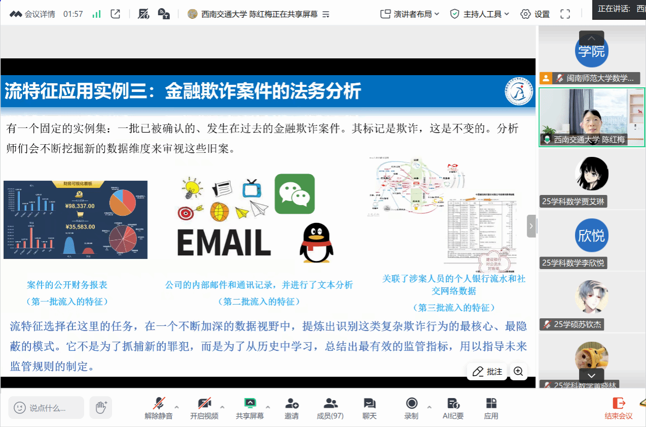 应我院邀请,10月26日下午,西南交通大学陈红梅教授在腾讯会议作了题为《利用模糊流形类内相关性和类间可分性的在线多标签流特征分析》的讲座。相关师生聆听了此次讲座,讲座由廖淑娇老师主持。
