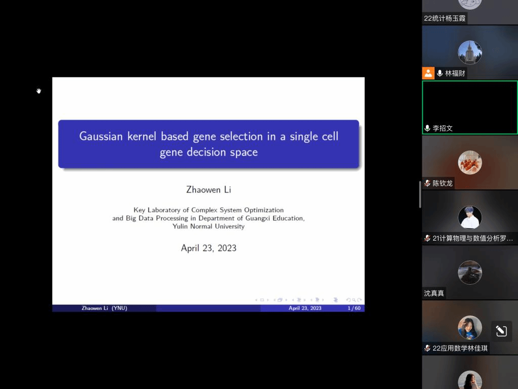 应我院邀请,4月23日上午,玉林师范学院李招文教授在腾讯会议作了题为《单细胞基因决策空间基于高斯核的基因选择》的报告。相关师生聆听了此次报告,报告由林福财老师主持。
