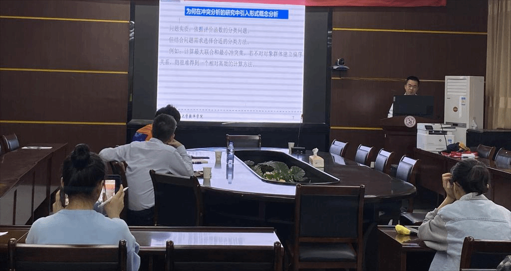 报告中,智慧来副教授主要介绍了形式概念分析(FCA)作为处理一种数据处理的有效工具已广泛应用于信息检索、知识发现、认知学习等领域。概念格由外延和内涵构成,外延是概念所覆盖的对象集,内涵是概念的特征描述。Hasse图能直观地体现概念之间的泛化和特化关系。冲突分析是在对策论的理论基础上发展起来的一种对冲突进行正规分析的决策分析方法。冲突分析利用已有信息对现实问题进行冲突事态的预测、评估和分析,帮助决策者作出科学的决策。本报告介绍基于形式概念分析的冲突分析的基本思路,并讨论基于模糊概念格的多层次冲突分析。主要包括任意集团的冲突态势分析,最大联合和最小冲突集的计算,增加分析层次时的冲突态势更新,以及最优冲突分析层次选择等问题。报告结束后,在座的师生就相关研究问题进行了探讨和交流。