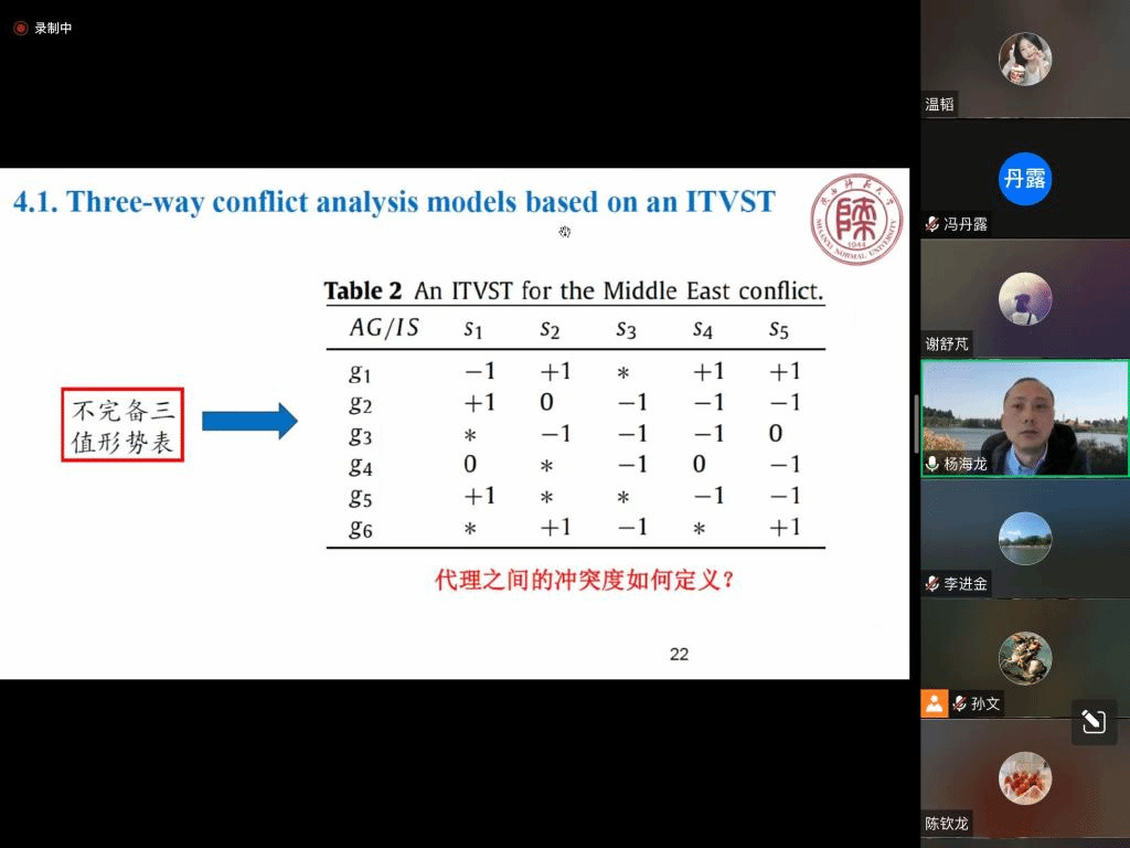 报告中,杨海龙教授讲解了冲突分析是在对策论和亚对策理论的基础上提出的一种对冲突进行正规分析的决策分析方法。冲突分析过程包括冲突模型的建立和稳定性分析。冲突分析的特点是利用已有信息对难以定量描述的现实问题进行冲突事态的预测、评估和分析,从而帮助决策者作出科学的决策。与传统对策论方法相比,冲突分析方法更易于结合定量分析与定性分析,更容易实现计算机辅助分析。本报告将简要介绍Pawlak冲突分析模型、Yao冲突分析模型,主要探讨我们在两种形势表下所做的三支冲突分析,包括基于不完备形势表的三支冲突分析和基于对偶犹豫模糊形势表的三支冲突分析。并提出一些进一步的相关问题。报告结束后,在座的师生就相关研究问题进行了探讨和交流。