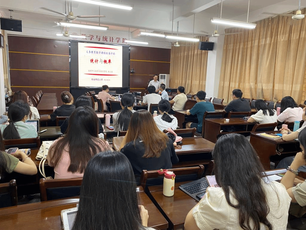 报告中,林火南教授介绍了在对《义务教育数学课程标准(2022年版)》“统计与概率”初步解读基础上,比较《义务教育数学课程标准(2022年版)》与2011年版“统计与概率”内容与结构变化,探讨2022年版新课标中涉及统计与概率的若干范例教与学问题,最后提出概率统计理论教与学问题,阐述在提高国民素质教育方面统计思维和统计方法重要性。报告结束后,在座的师生就相关研究问题进行了探讨和交流。