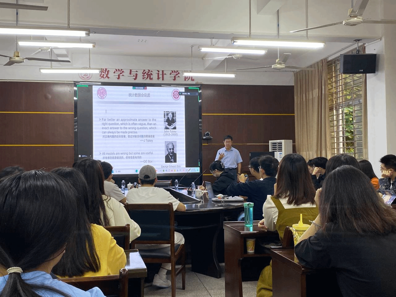报告中,王兆军教授主要介绍了如何用数据说话的主题。首先通过几个不同领域的例子,说明在利用统计进行数据分析时应注意到的几个问题,其次,说明统计与数据科学、数学、人工智能等学科的异同,对统计学学科及专业进行通俗系统的介绍。同时介绍南开统计历史,让在座的学生更加全方位立体地了解到一门科学学科成长历程,更加透彻理解统计学史。报告现场座无虚席,精彩的讲座深深吸引住在座的师生。报告结束后,在座的师生就相关研究问题进行了探讨和交流。