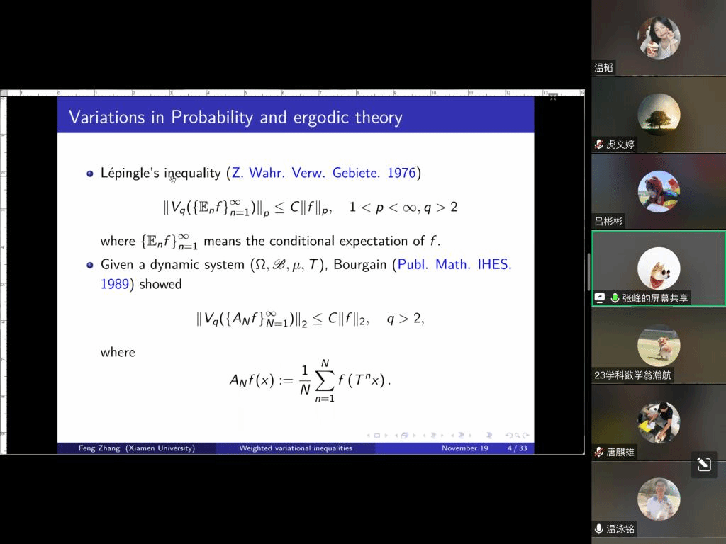 应我院邀请,11月19日晚上,厦门大学张峰博士在腾讯会议作了题为《RD空间上奇异积分的变差不等式》的报告。相关师生聆听了此次报告,报告由温泳铭老师主持。