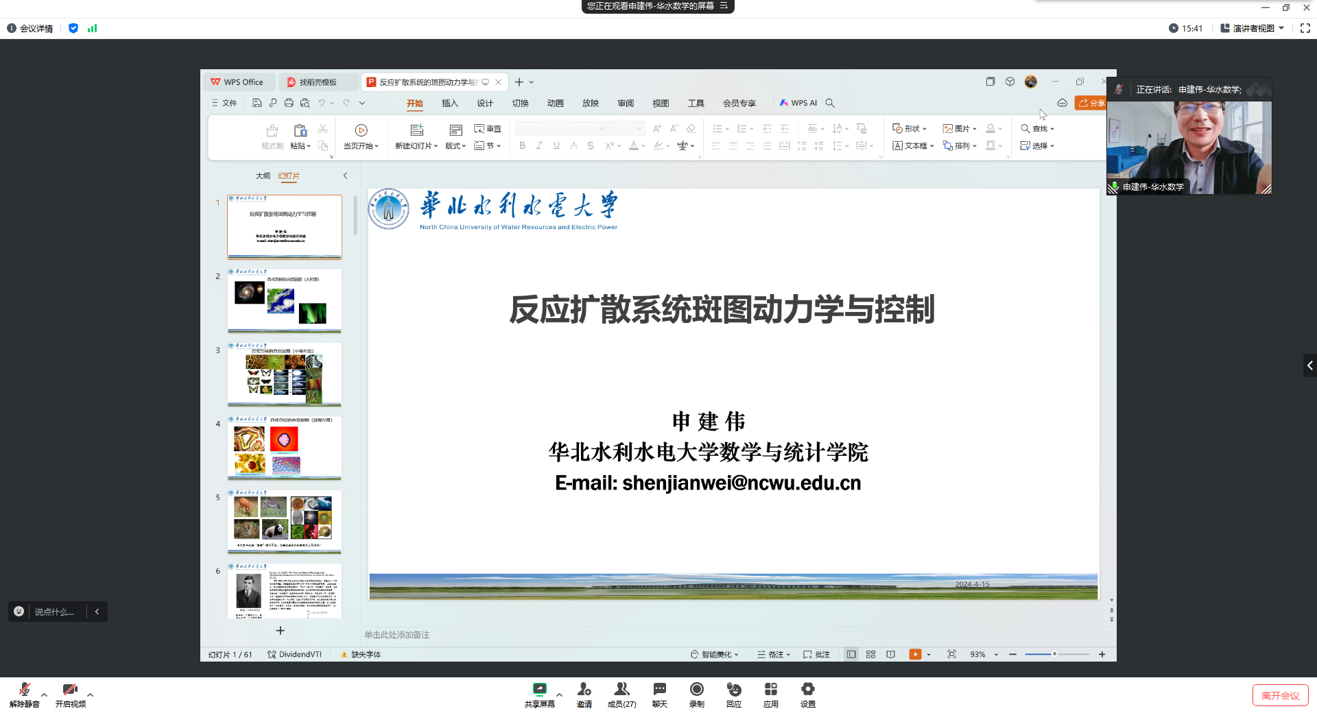应我院邀请,4月15日下午,华北水利水电大学申建伟教授在腾讯会议作了题为《反应扩散系统斑图动力学与控制》的报告。相关师生聆听了此次报告,报告由黄韩亮老师主持。