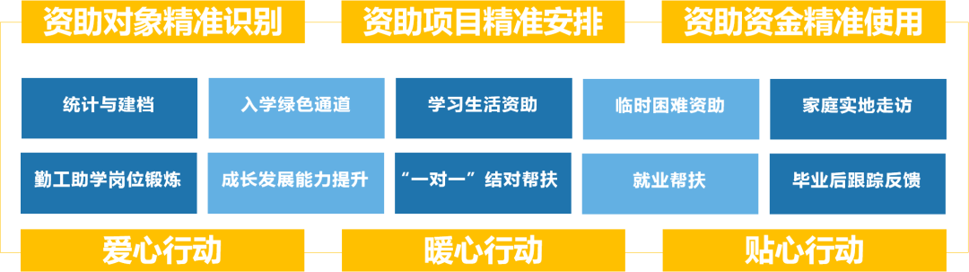在摸排假期突发重大变故学生情况、普查家庭经济困难新生、发放新生特困补助、发放路费补助、发放毕业生就业补助、畅通“绿色通道”、审核生源地助学贷款、评选优秀学生奖学金及专业奖学金、评选国家奖学金与励志奖学金、评定困难学生、评定国家助学金、评定学费减免等资助工作中,精准排查、专项补助、适时引导,以学生需求为导向,通过志愿服务平台、“学院之星”评选,建立起物质帮助、能力拓展、精神激励有效融合的资助育人长效机制,切实把党和国家对家庭经济困难学生的关怀落地落细落小、走深走实走心。