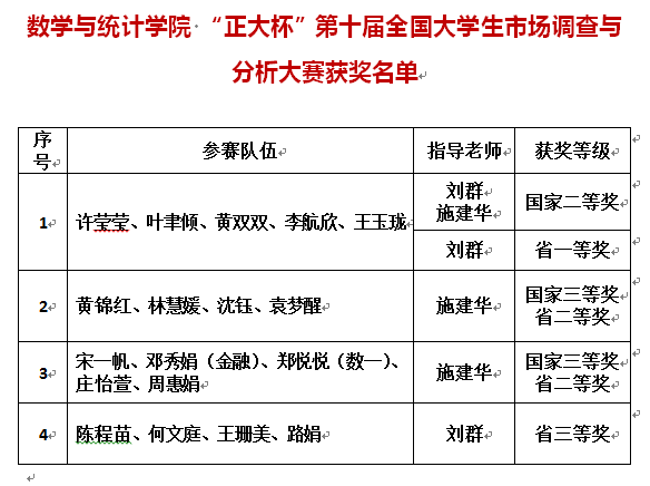 近日,由教育部高等学校统计学类专业教学指导委员会与中国商业统计学会共同主办的“正大杯”第十届全国大学生市场调查与分析大赛圆满结束。在本届市场分析调查大赛中,yl23455永利学子表现优异,在施建华、刘群老师的指导帮助下,四支队伍荣获国家级、省级荣誉。