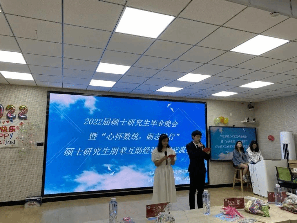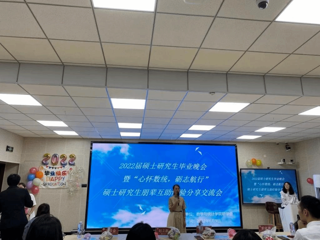 2022年6月9日19:00,yl23455永利于砺志楼131举办了2022届硕士研究生毕业晚会暨“心怀数统,砺志航行”硕士研究生朋辈互助经验分享交流会,学院党委副书记林晓老师,团委书记罗晓林老师,辅导员郑珊老师与毕业生们欢聚一堂,共同奏响毕业的骊歌。