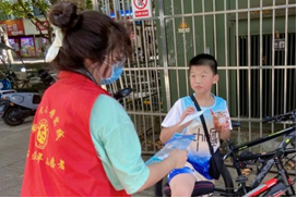 在暑假期间,韦昕怡同学积极参与了 “绽放战疫青春,致敬青春榜样”志愿服务活动。在当前疫情防控形势依然严峻复杂的情况下,她在各个街道劝导市民佩戴好口罩。让“出门就戴口罩”成为群众的自觉行动,用实际行动加强大家对防范疫情的重视。疫情中没有孤岛,是爱心将所有人紧密相连。