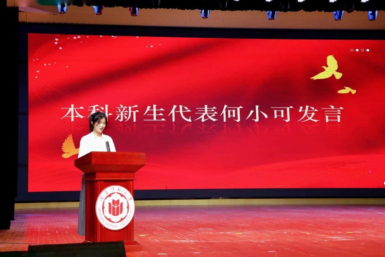 2024级本科生何小可作为新生代表发言。首先,她为学院提供这个舞台表示衷心感谢。同时祝贺各位新生,能在闽师相遇,带着沉淀,怀揣希望,踏入新的学府。她表示对校园充满好奇,期待校园生活,并会在接下来的学习生活中践行梦想。她祝愿24级新生能够勇敢面对挑战,相信大家在未来的大学生活能够创造属于自己的一番天地。