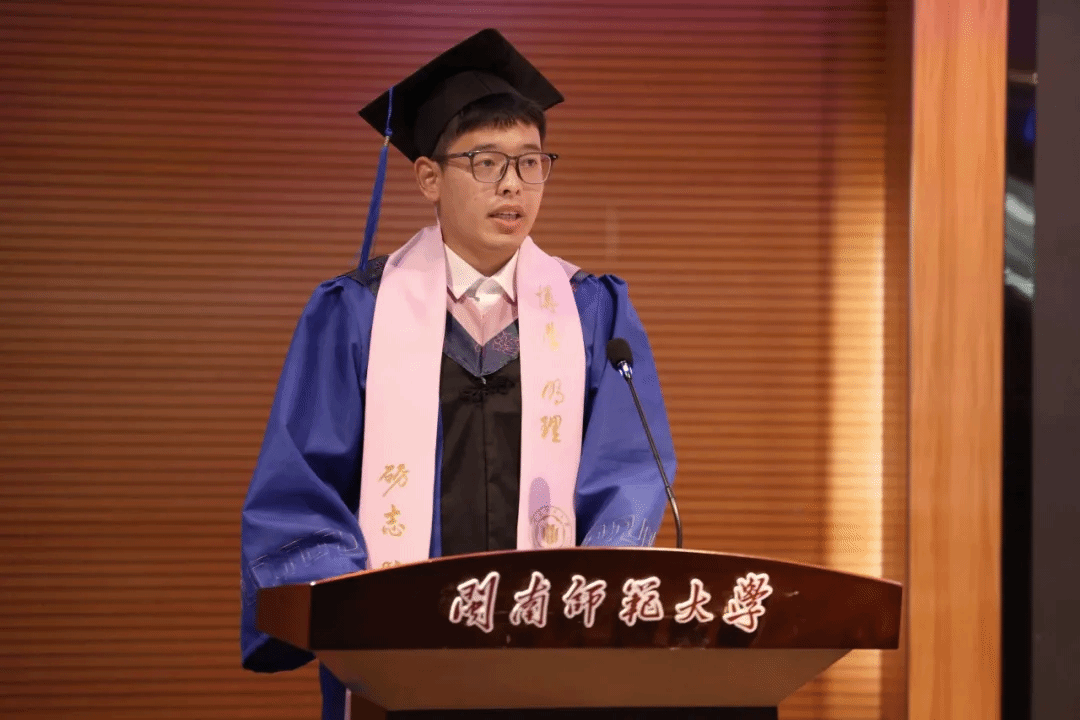 毕业生代表林俊荣同学的发言讲述了他在学校学习、生活的点滴,感谢学院的栽培及老师的指导,为学弟学妹们送上了寄语:珍惜大学美好的时光,铭记“博学、明理、砺志、笃行”的校训精神。发言最后,林俊荣祝愿学院再创辉煌,并为全体毕业生送上了最真挚的祝福。
